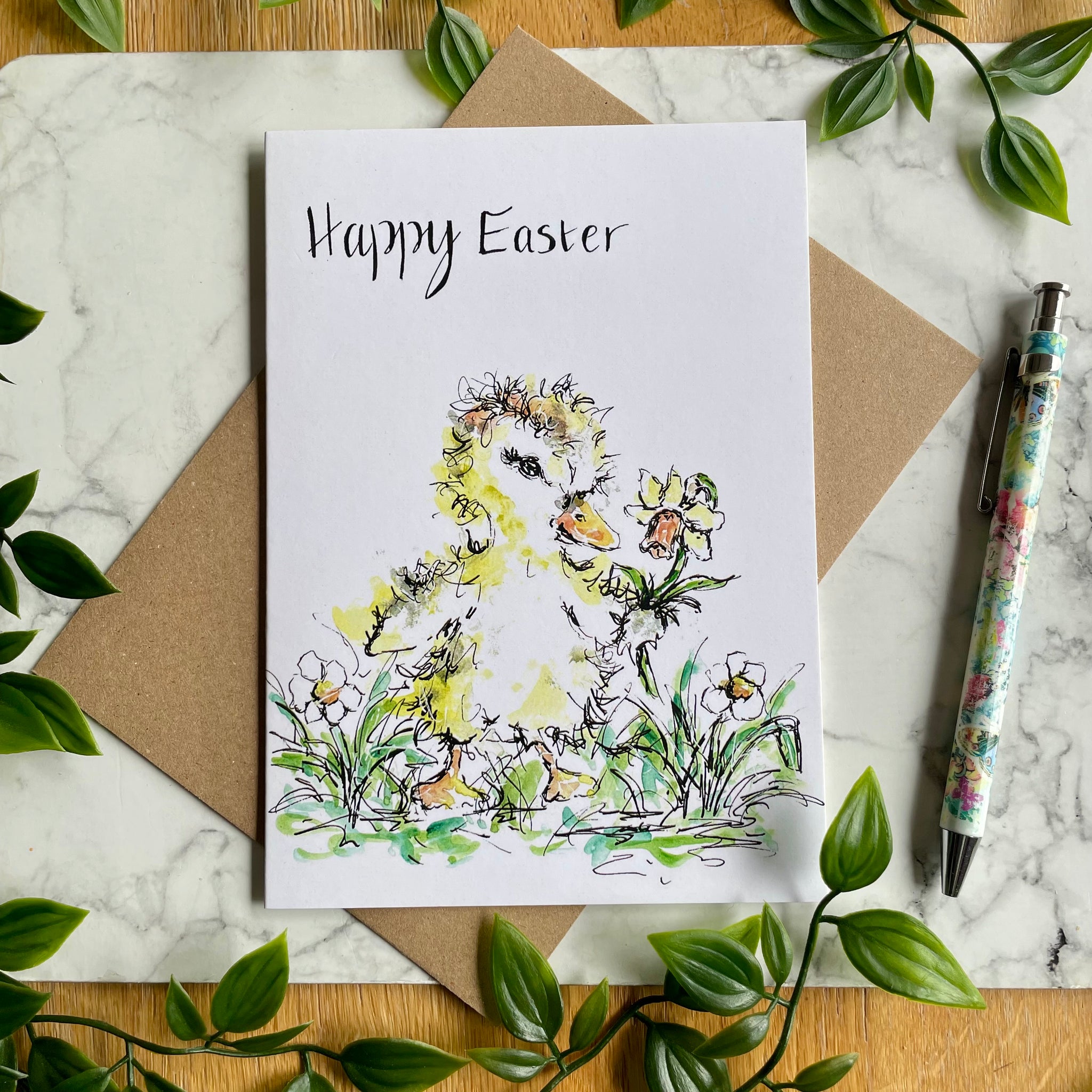It is hand drawn and hand painted with watercolours with hand written wording written at the top of the card with the Chick illustration underneath.