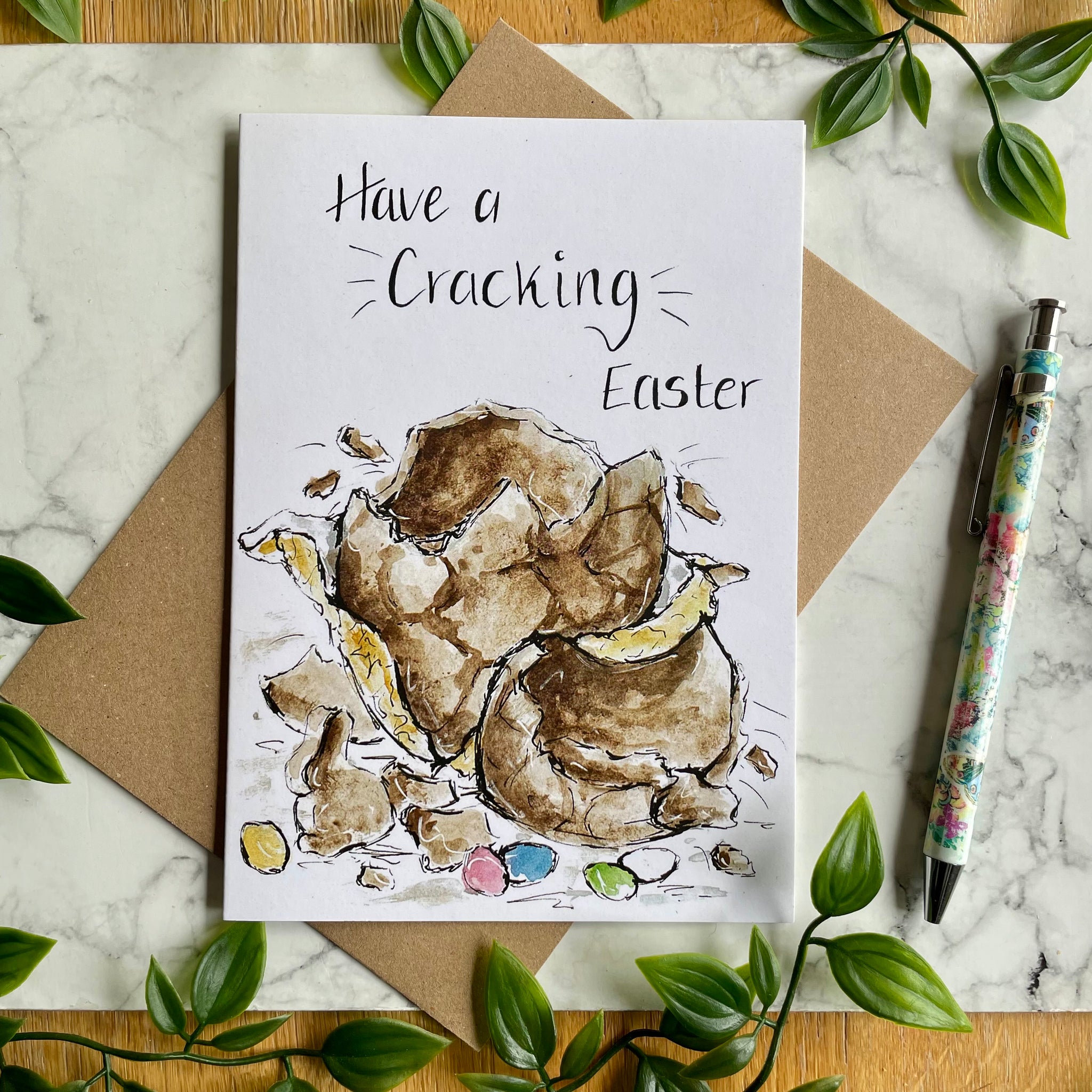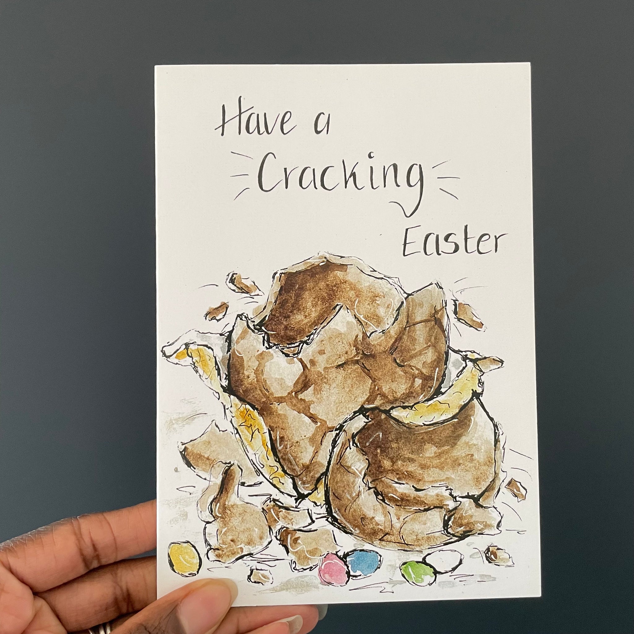 It is hand drawn and hand painted with watercolours with hand written wording written at the top of the card with the Easter egg illustration underneath.