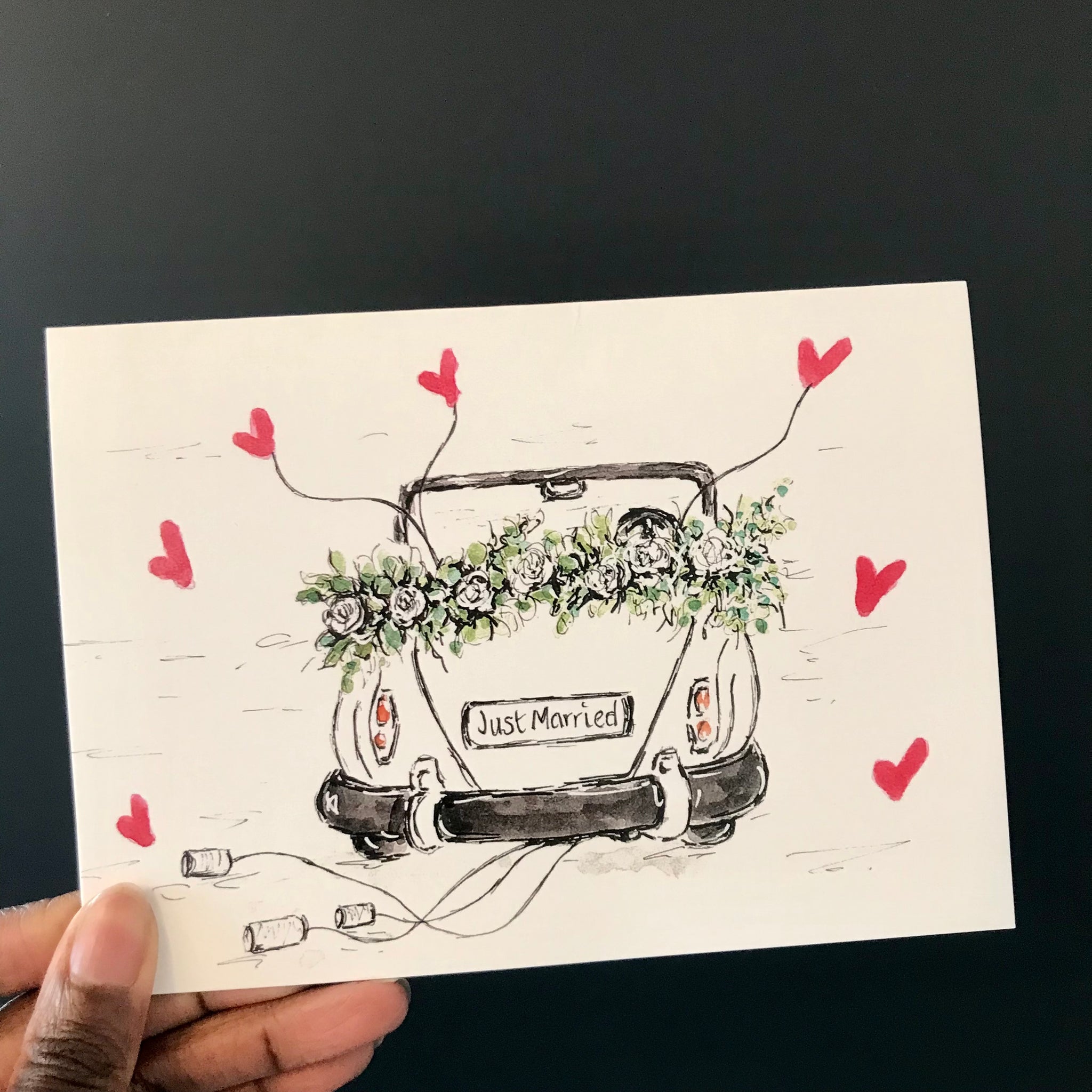 It is hand drawn and hand painted with watercolours with hand written wording written on the number plate on the back of the car.