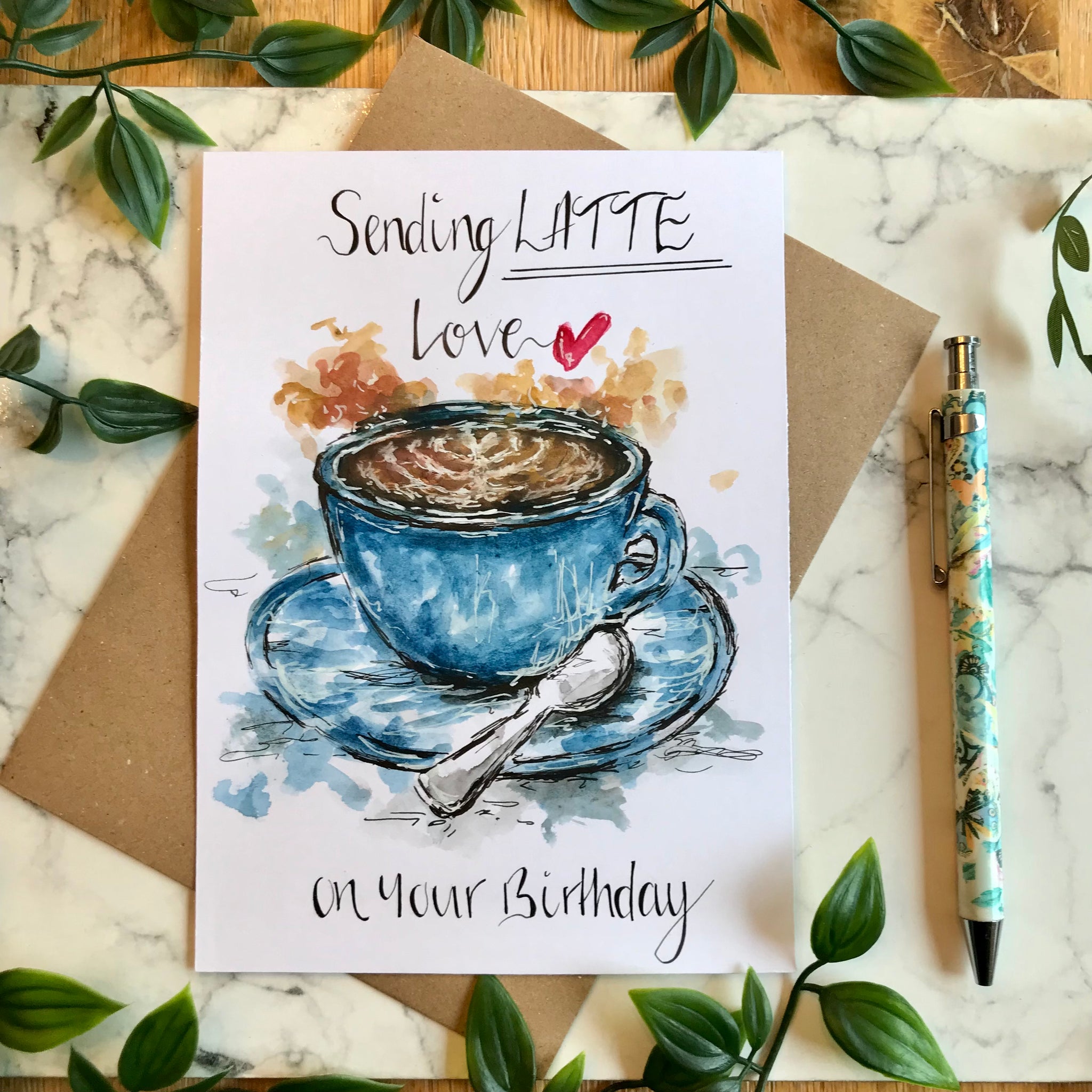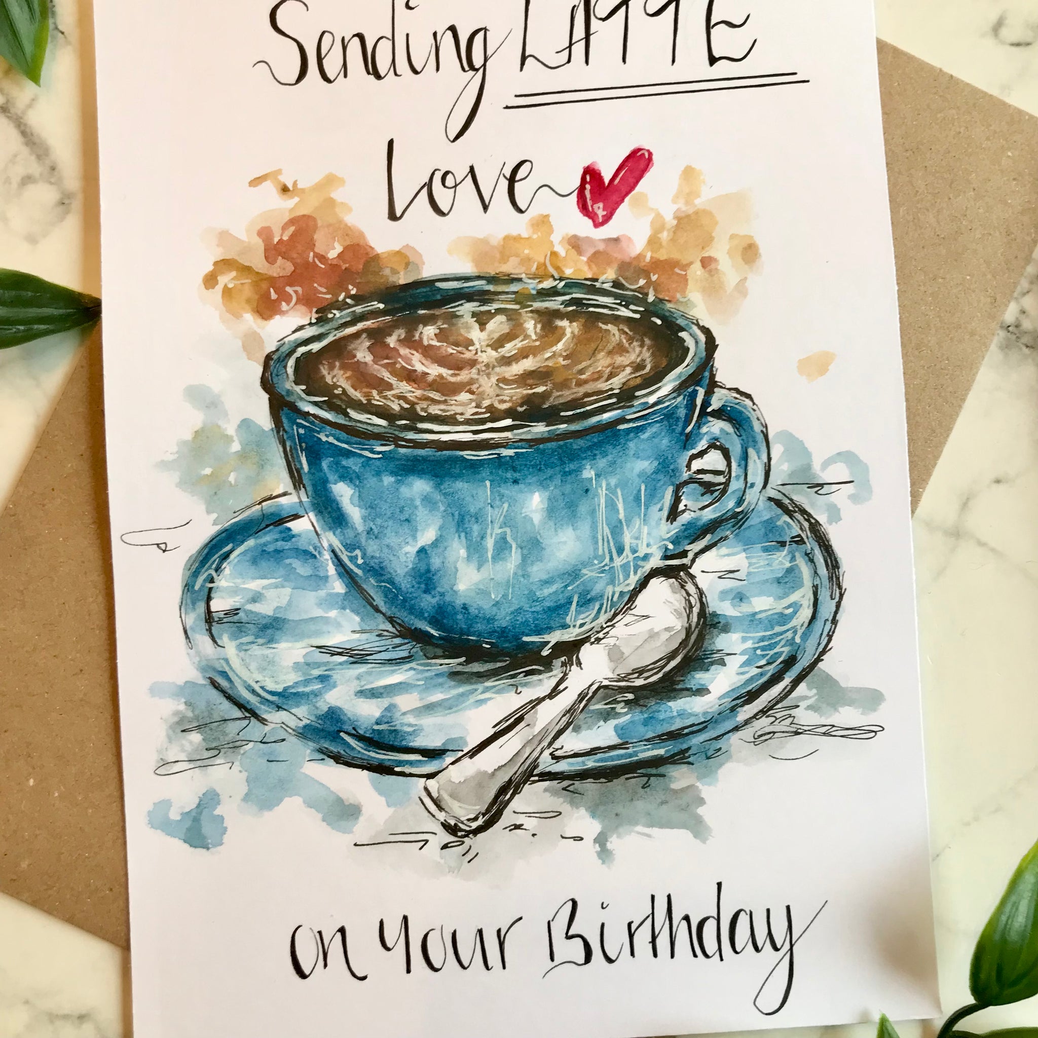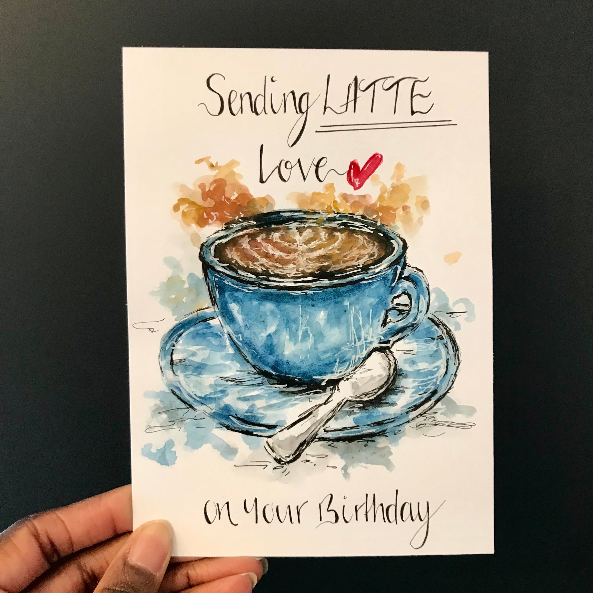 It is hand drawn and hand painted with watercolours with hand written wording written at the top and underneath the illustration.